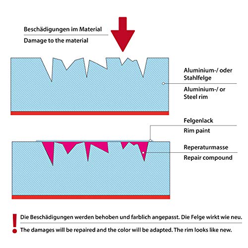 Reparatieset van aluminium fix: eenvoudig in gebruik. Duurzame reparatie. De velg kan tijdens de reparatie gemonteerd blijven. Hittebestendig tot 130 °C. Belangrijk, als de schade in de buurt van de remschijf is, bestand tegen trillingen en wasstraat. Met lakstift