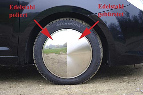 Hoogwaardige roestvrijstalen wieldop / wieldop in mat geborstelde luxe uitvoering en stabiele klemhouders. De wieldop wordt eenvoudig op de velgen gedrukt. De bestaande metalen krans zit dan stevig in de velghoorn.